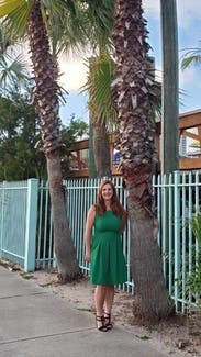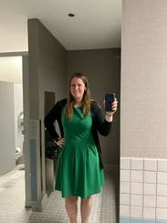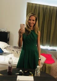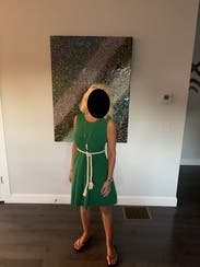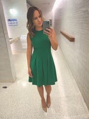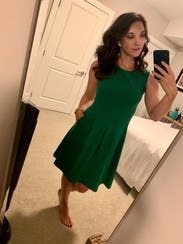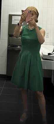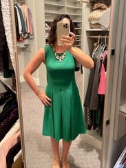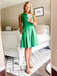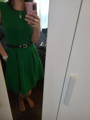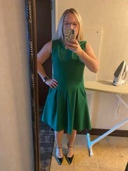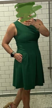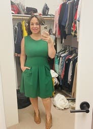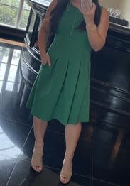 This beautiful dress was worn for work and was super flattering. I absolutely loved the vibrant green color and received many compliments. I also loved the pocket detailing on this dress. Highly recommend.