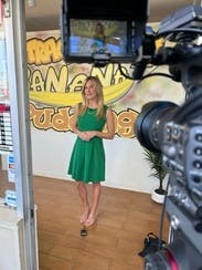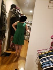 This dress is a gorgeous kelly green, very true to the color in the pictures. It is stretchy, and would recommend sizing down if you want it a little tighter. Hits at the knee, wish it were a little shorter. Overall good rental.