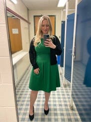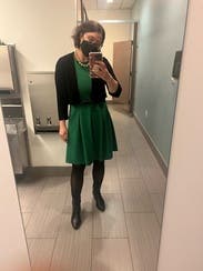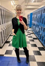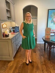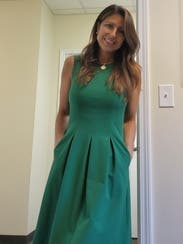 I love this dress! It's a bold kelly green color. I thought it was going to be stiff but this dress is actually comfortable and stretchy. Pockets are always a plus!