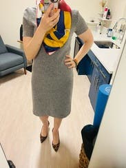 This was a good professional choice paired with a blazer for court appearances, and modest enough without for the office and lunch. It's kind of blue up close, but grey far away. I liked it and would rent again. Nothing fancy.