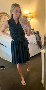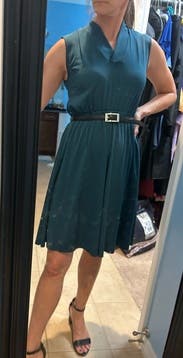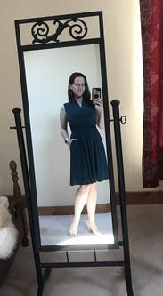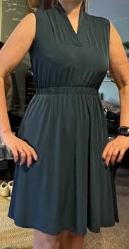 Terrific dress for summer office work and date night alike! Very comfortable, nice fabric, great dark teal-green color. The neck is nice - high in the back (like a mock neck, which helped warm me against summer office A/C!). The elastic waistband can twist a little, but is easy to adjust. Great pockets that aren’t bulky/visible. Solid rental - I want to get it again in winter to wear with tights and a cardigan! Fully A-line so I’d rent to fit chest/waist (size Small was perfect for 34B/small size top).