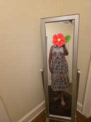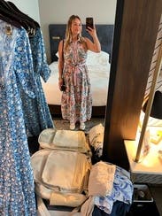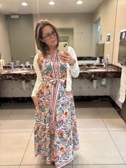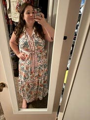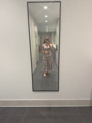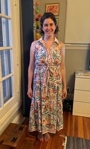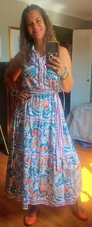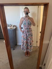 Hands down my favorite rental so far. I’ll be wearing this one on repeat all summer. The drape is beautiful, the pattern is even prettier in person, and I get compliments every single time I wear it. The fabric is light and breathable, perfect for hot days. It also fits a pear-shaped body really well. Just an all-around beautiful dress!