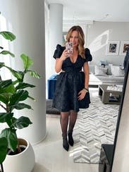 So flattering. The silhouette is unique but in black is still understated. Perfect for a cocktail event!!
