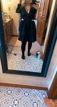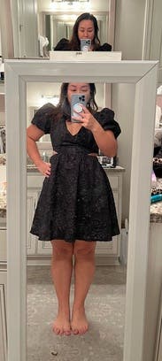 Cute, flattering, and comfortable dress. My size fit. I liked the texture too. Wore it to a cocktail reception at a fancy hotel. I was worried it would make me look poofy or overwhelm me because I’m short but the V neck and cutouts balance everything out.