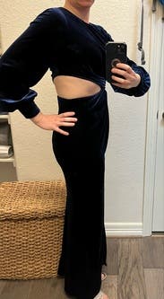 Beautiful, classy, and comfortable dress. A hint of sass with the side cut out, and the cut out is at the rib so you can still wear spanx. My only footnote is that the velvet got a little hot with all the dancing we did! Otherwise, great dress.