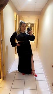 This was the perfect dress for the event I was attending! The cut out was fun but not too revealing, same with the slit it showed some leg but wasn’t crazy high. I am typically a size 14 and the 14 was true to size. The stretchy velvet made this very comfortable to wear all night. I will note - I am 5’ 1” and wore very short heels with this. Taller ladies may have an issue with the length!