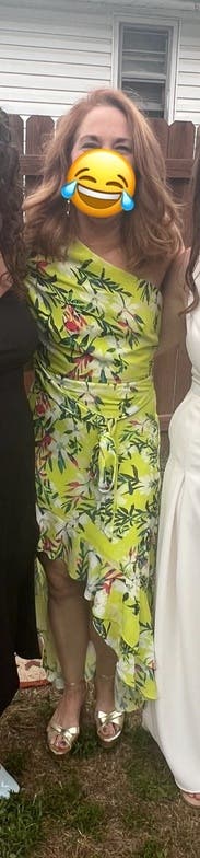 I wasn’t sure about this bold, one-shouldered dress, but it totally exceeded my expectations, fit perfectly, and flowed beautifully when walking. My husband said it looked so cool when I walked, because the way it is cut—the skirt has a nice flourish. I wore it to a Miami wedding on a beautiful day. It was the perfect rental for the occasion.