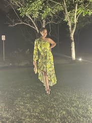 Loved loved loved wearing this dress - it fit like a glove and hugged in all the right places. Wore it for a tropical destination wedding and the fun print/colors, one shoulder and ruffled slit cut made it a one-of-a-kind fun dress to wear and dance in all night long!