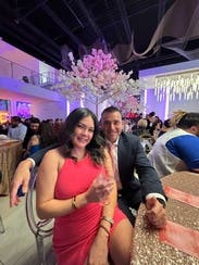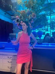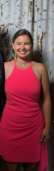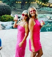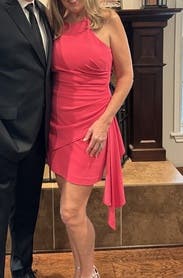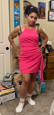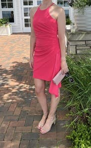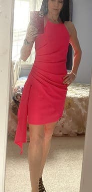 I'm genuinely looking to buy this dress. It is incredibly flattering and it has some stretch to it, which is great for dancing. It's soft and the folds help hide any tummy bloat which is nice. I could have worn the 4, but it was a little gaping in the arms. The 2 wasn't too snug at all, it actually could have been a little tighter. The color is PINK like NEON pink which is super fun.