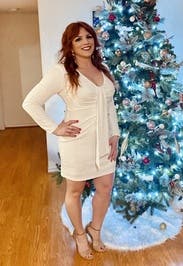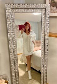 I don’t usually wear white but loved the look of this. So fun for a winter, cold weather holiday party. Super flattering cut, great material and not itchy