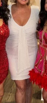 Beautiful dress and attention getter! The pictures don’t do the sequins justice, they are just the right glam for any party event. The size 8 dress fit me perfect, but I chose the size 10 because of the fundraising event I went to in which I wanted a more conservative look with a longer length on the skirt. I would definitely wear the size 8 for a more form fitting party look. A very comfortable dress and mind blowing for my husband!