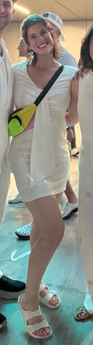 Great dress for splashing out at your bachelorette! The deep v-neck is super flattering without being too low cut to wear a regular full coverage bra, and at 5’10”, not too short to wear out dancing. Just keep your arms down. 😄 The dress sequins did not catch on itself often, maybe 2-3 times total all night. Stretchy fabric, though definitely got warm on a 70° night even if it wasn’t heavy. Would 100% recommend!