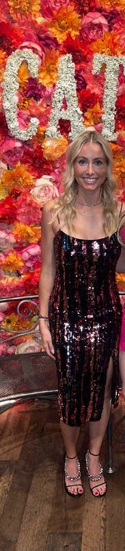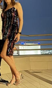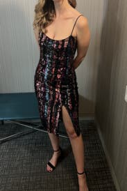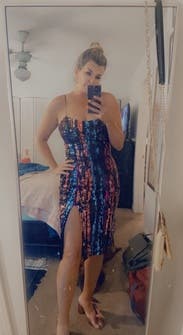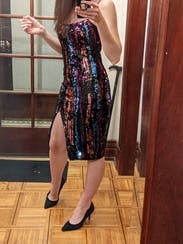 I rented this for a disco-themed bachelorette party & it was perfect! The sequins and color made the dress so fun, the fit was true to size, and the length with the slit felt sexy but still classy. It was easy to dance in, too! I got a ton of compliments. My only complaint is that the straps were just a bit long and not adjustable, but I did not feel over-exposed. I would rent again in a heartbeat.