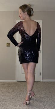 This dress is pretty close to perfect. It had sleeves (which kept me warmer than usual). Despite it being backless, you could get away with no bra at all since the sequins just glitters and distracts. The light colors are up top as well, so even my larger hips weren't as prominent, since the eye was pulled up top. I'm on the petite side so the skirt wasn't too short at all and paired well with heels.