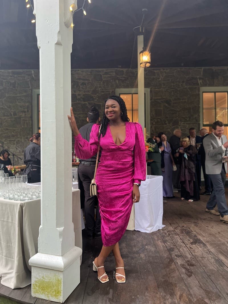 Pink satin (75% Viscose, 25% Rayon). A-line. Long sleeves. V-neck. Back zipper closure. 49" from shoulder to hemline. Imported.