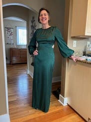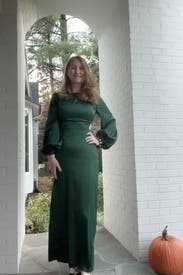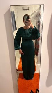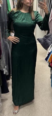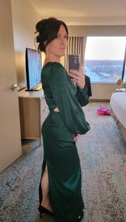 A classic silhouette that fits well. Elegant touches with the bishop sleeve and subtle pattern in the jewel tone green. The cutouts on the side were minimal and fine to wear to a formal event. Be forewarned, though; you can probably buy this dress. My rental rate was $20 shy of owning it.