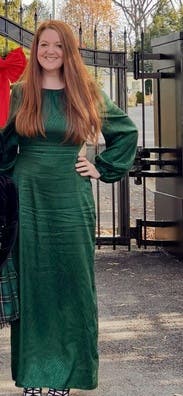This dress is gorgeous and comfortable. I received lots of compliments. Great formal dress for winter. I’m 5’6” 120 pounds and the size 2 fit perfect. There wasn’t a lot of extra room in the mid section so after dinner it wasn’t as forgiving in that area.