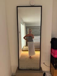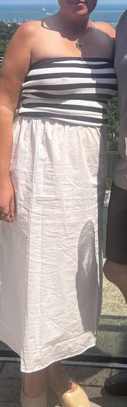 Wanted to love this so much but it just isn’t flattering. It has a drop waist and that wasn’t for me. I folded it one time to make it work. Great quality, just Not my fave