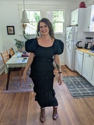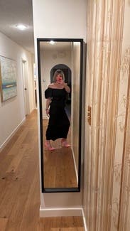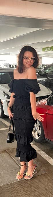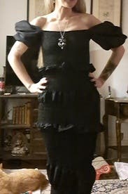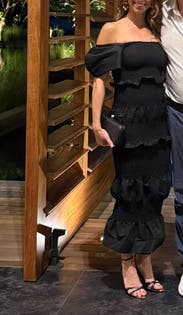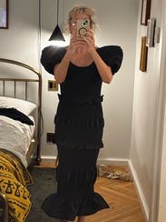 Obsessed. Fit so well, so fun, so flattering. The details, ruffles, and sleeves were amazing. Wore for a black tie wedding and it was perfect. The armpit holes are definitely a bit tight so you could size up or even wear off the shoulder