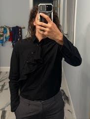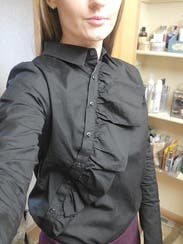 Pro’s - I liked the unique diagonal collar and ruffles. Cons - It was difficult to button up at such a weird angle, and was boxy fit.