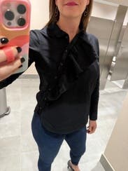 Obsessed with the one giant ruffle on this shirt. Beautifully tailored fit.