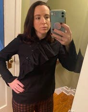 Overall I like this blouse. The unique buttoning detail and ruffles make it standout but the black makes it very wearable. My only complaint is that the fabric isn’t forgiving - even after ironing and a quick steaming, it’s not crisp and wrinkle free.