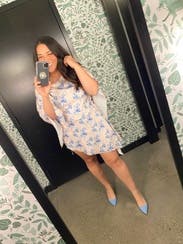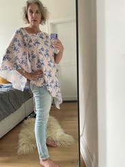 The fabric felt so good and the print is really pretty. It looked pretty with nice pants but also a bit more casual with ripped jeans. I thought about buying it, but it wasn't waist-defining enough for my shape and the price point was too much for not being 100% flattering. Word of warning: those strings are very long, so you will need to tie them up in the back or hold them when you're in the bathroom!