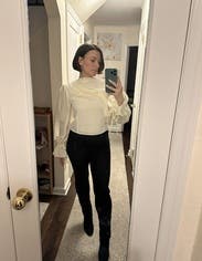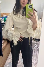 Such a fun and unique top that stands out in an elegant and stylish way. The only caveat is that the back hemline is too shot to tuck in to most bottoms. I’d recommend planning to wear it untucked or with an ultra high waist bottom.