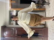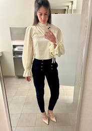 You need to know how to pair this shirt, otherwise you’ll wind up looking like a pirate. If done right, you can look classy and elegant. I love the silk feel of the shirt. Love the crepe details around the neck and beautiful bell sleeves. Runs slightly tight and short at the waist.