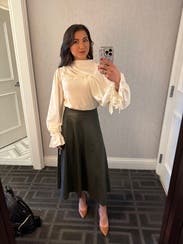 Saw someone I follow on TikTok post a video in this top and immediately came to rent! Wore this several times while I had it - with jeans and work slacks. Could dress it up with a skirt as well. Gorgeous color and material and loved the way it draped. Wish I owned this one!
