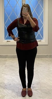 It’s not a tight fitting corset. If you want it tight, size down. Normal size will fit just right though! I loved it. So flattering. It zips up in the back. I paired it with good American leather pants