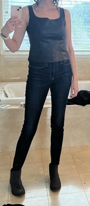 I thought I could wear mid high jeans with it but this too was the length of my torso. Felt a little awkward with any Jean to avoid a pooch. Loved the quality though and wanted to wear more.