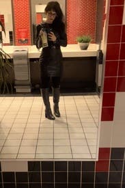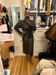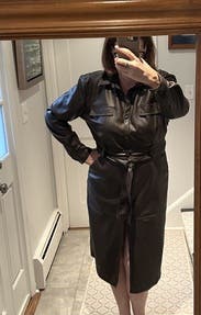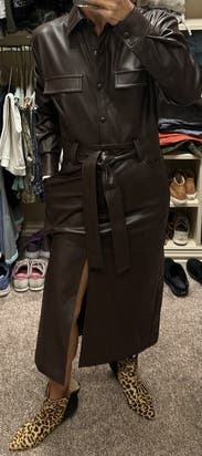 The pleather is a lot softer than I expected and it was super comfy to wear. Fit great. The front slit is very high and when you sit it comes right up to top of your legs so you’ll need to consider that when wearing! Nice length for tall people.