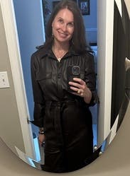 The leather look and high slits are sexy, but it is covered up enough that you can still wear to work. If the slits bother you, you can wear a slip.