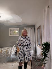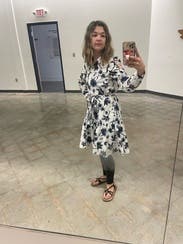 It was too large for me, but I made it work. If you wear it with a belt, boots, and a sleeveless coat, this summer dress can transition to colder temps. The fabric is basic cotton.