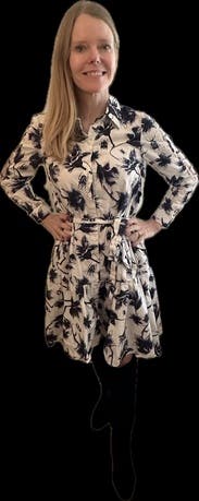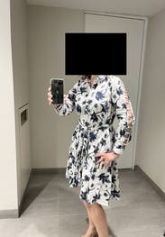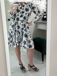 The print is beautiful and whimsical! The fit was perfect. Love the long cutout sleeves and the shorter hem on the front of the dress and longer back. The dress has pockets (LOVE!) and a belt to cinch at waist. Loads of compliments.