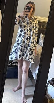 I liked this dress more than i thought I would! I love the print with flowers and insects. I love the cutout in the sleeves. I’m cold natured so I wore leggings underneath. The fabric in was that of a white button up shirt so it does wrinkle but not too bad. I would rent again! I loved it.