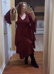 Beautiful dress, wish it was a different color (this isn't the best on me), but the cut is amazing and I literally had random strangers stop me to tell me how much they loved my outfit (wore it with tan half boots that button up the side).