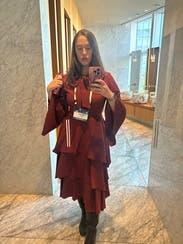 Wore this for winter graduation photos. It's lovely and the color is gorgeous! As others recommended, size down!