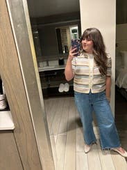 Absolutely loved the front of these jeans. The pocket styling is adorable (just don’t plan on using the pockets for anything). Sort of giving 70s vibes. The sizing was accurate and the 26 fit perfectly around my thighs, hips, and booty. Slightly snug in the waist but if I go up a size they will be too loose elsewhere. Front and back views are great, it’s the side profile I just felt awkward. These are very flared at the bottom and definitely feel like a bell bottom pant that is too short on me. I just had a really hard time styling these on my frame. Adorable on the model but not on me.