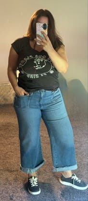 Love the wide leg flare of these. The jean material was a great thickness and stretchy. The pockets on top weren’t my favorite/ didn’t flatter my belly but otherwise great jeans.