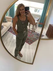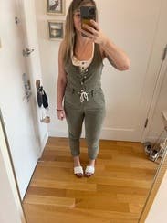 I was hesitant, but ended up loving this jumpsuit! Thicker material that made it fun for an outdoor evening events (grilling out, campfires, late night dock sitting). Sexy neckline (more revealing than I typically go), form fitting, and relaxed look all at the same time!
