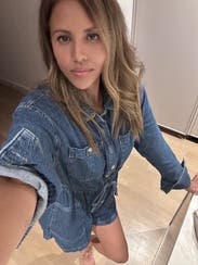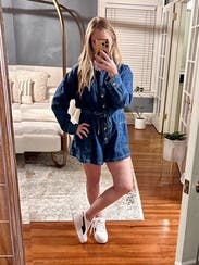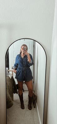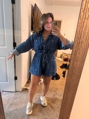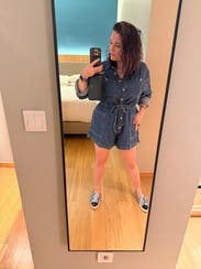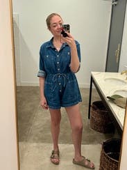 I’ve always wanted a denim jumpsuit, but something was always off. They’re usually too costume-y with western details, or overly fitted with no sleeves or short sleeves (more “going out” than casual). I’d been telling my husband it was a piece I’ve wanted in my wardrobe for years, but I never found one that felt classic and simple. This one finally got it right. Most short jumpsuits are tight in the legs (think jean shorts), and I wanted the opposite…like, this one is intentionally oversized in the best way. The shorts flare out slightly like butterfly shorts, which I loved. It does run big, and I included a photo of the backside because I had a lot of extra fabric there and would’ve appreciated seeing that in reviews myself. But the drawstring waist lets you cinch it in exactly where you want. I actually loved that…it makes it flattering without being clingy, and I know I’ll be able to wear it through lots of body changes or seasons. I ended up buying it because it’s one of those low-effort, high-reward pieces I know I’ll throw on again and again. Just a run-out-the-door kind of outfit that still feels put together. The long sleeves were another win. usually sleeves are too short on me, but these had a bit of extra length in a way that felt cozy and relaxed. Highly recommend - this one will be so cute for fall too. Snapped a quick pic in the fitting room since that’s the only place I got a photo!
