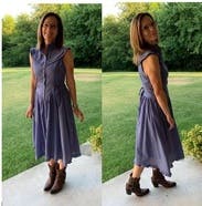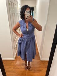 It looks so good on the model, and so Little House on the Prairie on me! Way too much volume + length combined in the skirt, and I'm someone who is usually tall enough to pull off midis. Also, there was a little pulling over the chest for me, and the color was duller in person. Couldn't even get myself to wear it to work for one day. Oh well.