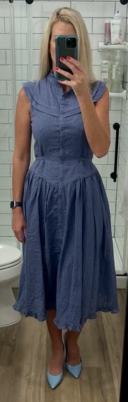 Loved the color and style but It was so tight at the bust I had to leave it unbuttoned and wear a slip under. I suggest sizing up.