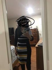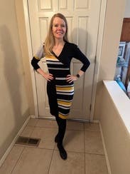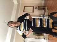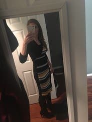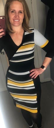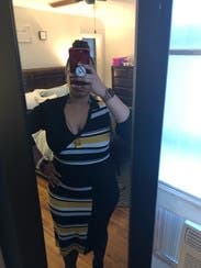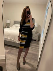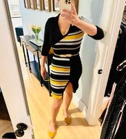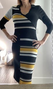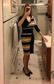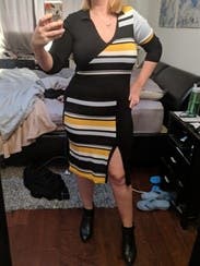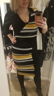 I rented this for a trip, but we ended up getting snowed in so I just wore it around my friend’s house hanging out with her dogs instead of exploring the city. The dress wasn’t what I would normally wear to hang around, but ended up working out since it was quite comfortable. It would have been perfect for work or going out on the town in the winter (but not a snowstorm). Due to the circumstances, I didn’t get a great picture. Fit wise it was perfect. Flattering and form fitting without being uncomfortably tight. Yellow isn’t normally my color, but the grey and black offset it nicely and didn’t wash me out.