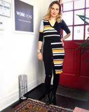 If you're ok with bold colors, this is a fun dress to wear. It's a sweater dress but with some sexy cuts in both the bust and thigh slit. It's a nice mix of cozy and sexy. If you're office is conservative, might not be a good office look but worked for my office I found it really flattering and easy to wear.