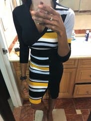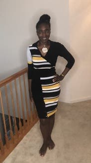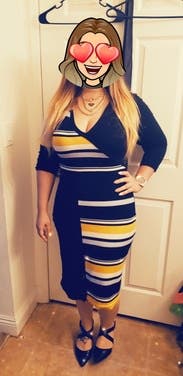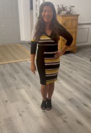 This dress fit like a glove. It shows off all your curves, so if you work in a conservative setting, you may want to size up. The pattern is unique and is sure to generate attention. Prepare for the compliments.