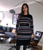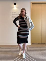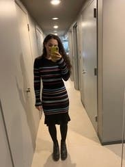I wore this at a small conference in NYC. Nice shape but not too snug. Soft knit that breathes well so you’re not too hot or cold. Loved it with the denim jacket and my turquoise jewelry.