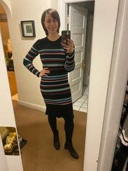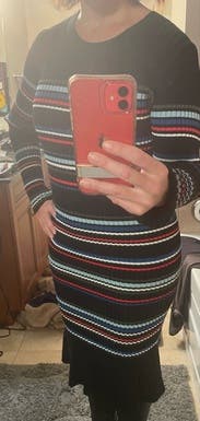 Cute and cozy. Thick, warm, high-quality material with sweet flair at the bottom. Perfect dress to wear to work comfortable with my little bump (2nd trimester). Highly recommended. Falls right below my knees, unlike many other dresses which my 5'2'' frame seems to swim in. Will definitely rent again.